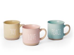 Peace, der blaue Becher aus der Serie Joy, Love & Peace, Steinzeug, 0,25l - Freude, Liebe und Frieden - was braucht man mehr für ein glückliches Leben? Die fröhlichen Pastellfarben dieses schönen Keramikbechers sind fein aufeinander abgestimmt und unterstreichen den sonnigen Charakter dieses besonderen Artikels. Die Buchstaben des Designs sind in Form einer 3D-Glasur auf die Oberfläche aufgebracht und erzeugen so eine spannende Produkthaptik. Der cremefarbene Sockel und Henkel bilden einen gelungenen Kontrast zu den zarten Grundfarben des Bechers und so entsteht eine ausgewogene Gesamtoptik. Die Füllmenge von 0,25 l eignet sich ideal zum Genuss von Tee und Kaffee.