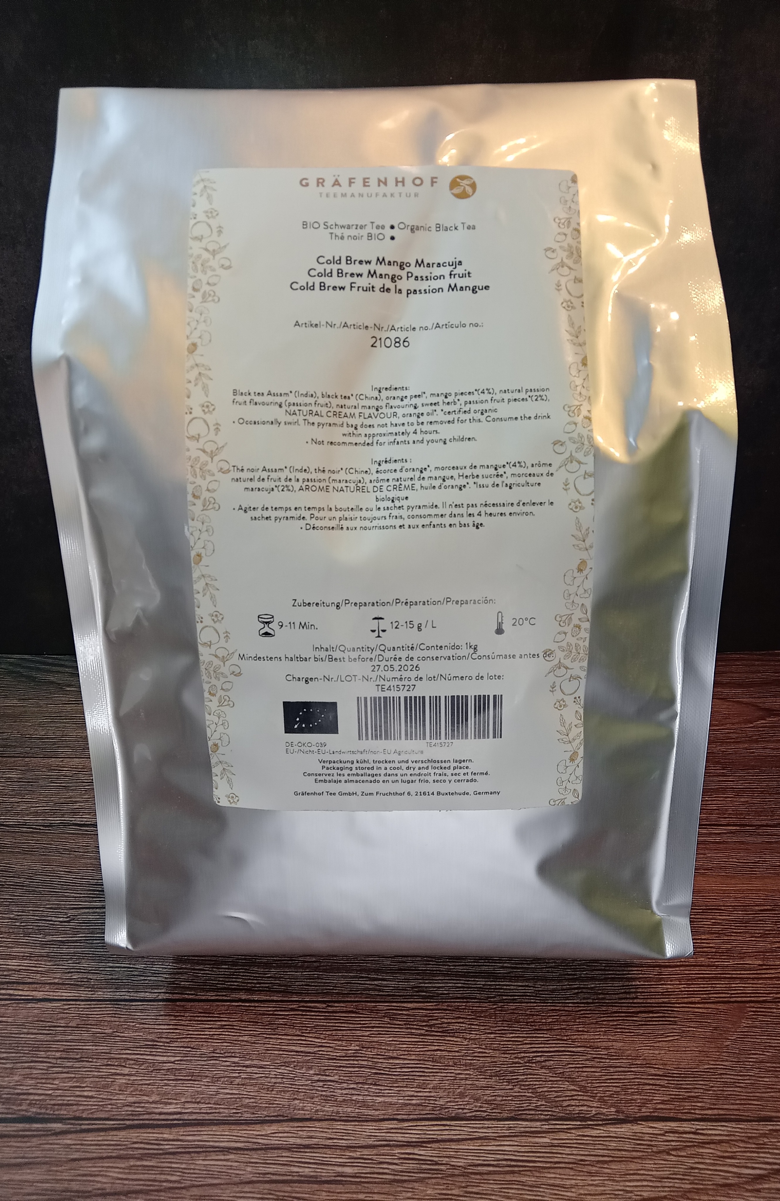 Die Zubereitung ist kinderleicht: Einfach 1-2 Teelöffel des BIO Cold Brew Mango Maracuja Tees in eine Tasse geben, mit kaltem Wasser aufgießen und 9-11 Minuten ziehen lassen. Magst du lieber einen intensiveren Geschmack, dann lass den Tee etwas länger ziehen. Du kannst den Tee auch mehrfach aufgießen, gebe entweder etwas Tee dazu oder lass den Tee länger ziehen. Der Tee sollte innerhalb von ca. 4 Stunden verzehrt werden, um einen stets frischen Genuss zu gewährleisten.