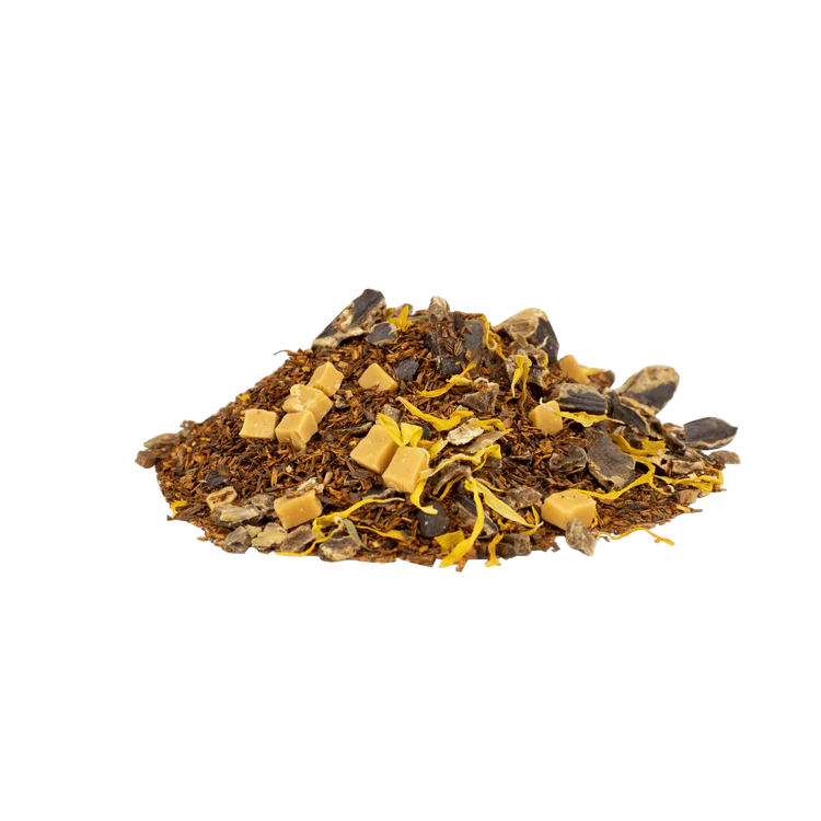 Rooibos* (Südafrika), Johannisbrot*, Dattelstücke* (Datteln*, Reismehl*), Honeybush* (Südafrika), natürliches Karamellaroma, KARAMELLSTÜCKE* (Rohrzucker*, Glukose Sirup*, Kondesmilch*, Butter*, Salz*), NATÜRLICHES SAHNE-AROMA, Ringelblumenblüten*. *aus kontrolliert biologischem Anbau