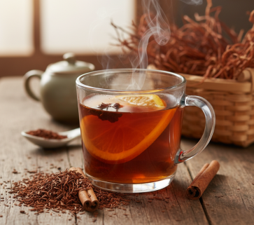 Rooibos-Tee (auch Rotbuschtee genannt) ist ein koffeinfreier Kräutertee aus Südafrika, der aus den fermentierten Blättern der Pflanze Aspalathus linearis hergestellt wird. Er ist besonders für seinen milden, süßlich-erdigen Geschmack bekannt und wird oft als Alternative zu schwarzem oder grünem Tee getrunken. Rooibos ist koffeinfrei, reich an Antioxidantien und magenfreundlich.
